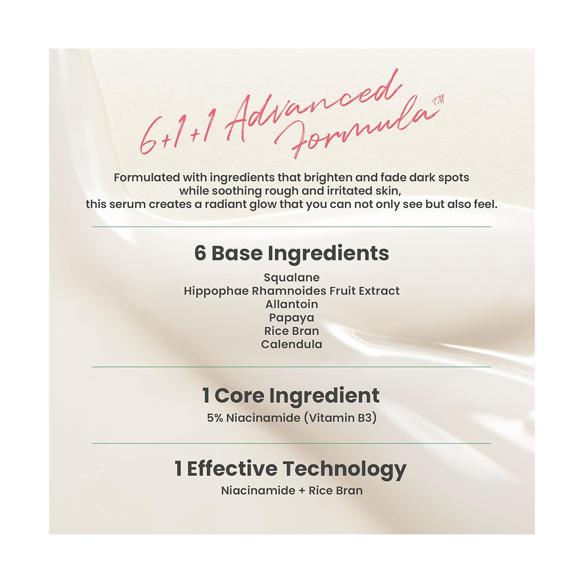 - Six botanical extracts including Sea Buckthorn and Rice Bran for radiance.
